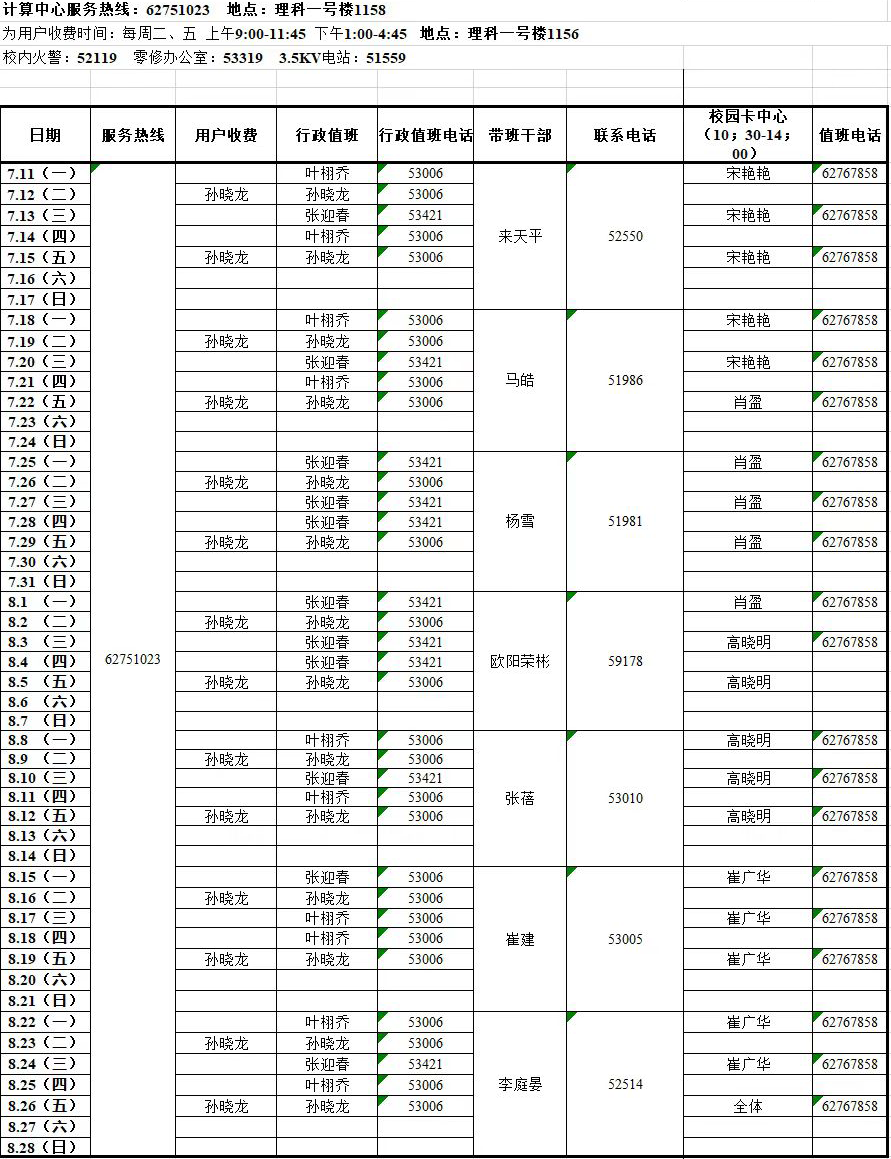计算中心2022年暑假干部带班和用户服务值班人员安排
