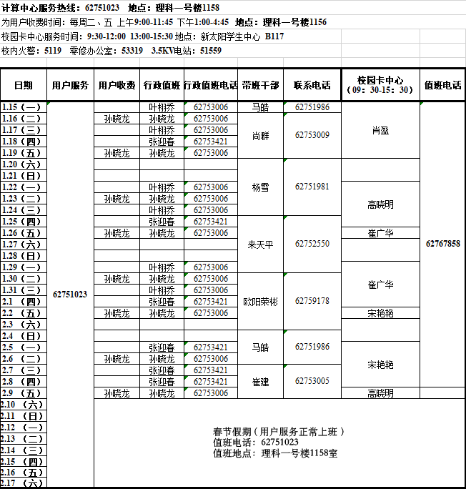 计算中心2024年寒假干部带班和用户服务值班人员安排表
