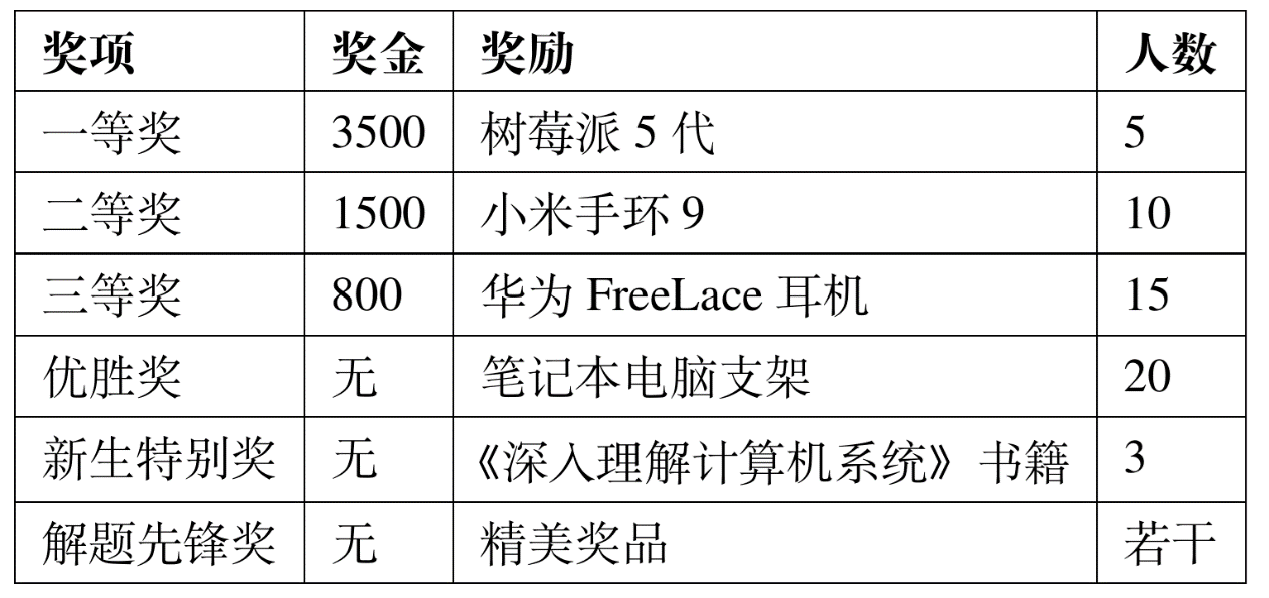 大赛设置一等奖、二等奖、三等奖和优胜奖若干。此外,大赛还设置了新生特别奖和解题先锋奖。各奖项奖金、奖品与获奖人数设置如下: