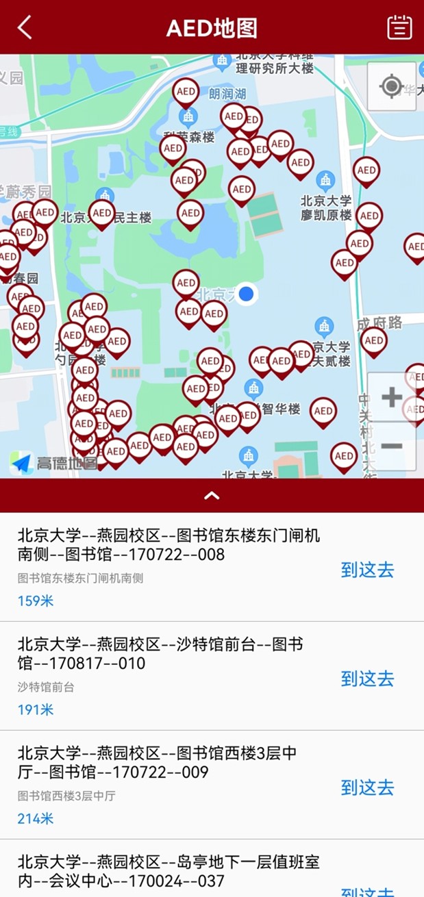 2.实时定位,系统将自动显示用户附近所有AED设备,包括详细位置(如教学楼、体育馆、图书馆等)。
