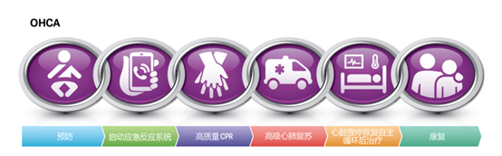 心脏骤停救援流程:呼叫120→心肺复苏(CPR)→尽快使用AED。