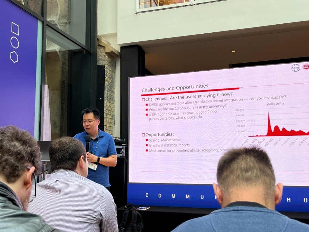 王博老师在 “Trust and Identity in Motion” Community Hub分会场发表题为《Challenges and Opportunities in the China CERNET Identity Federation (CARSI)》的专题报告,围绕 “中国高校为何加入 CARSI 联盟(IdPs 与 SPs 的驱动力)” 及 “联盟发展面临的挑战与机遇” 展开,详细介绍了 CARSI 为中国高校提供的联合身份管理与全球学术资源访问服务。特别阐述了CARSI 项目团队在 “用户驱动的系统演进” 中的实践经验,展示了集成工作流、安全防护、规模扩展等共性挑战的解决方案。