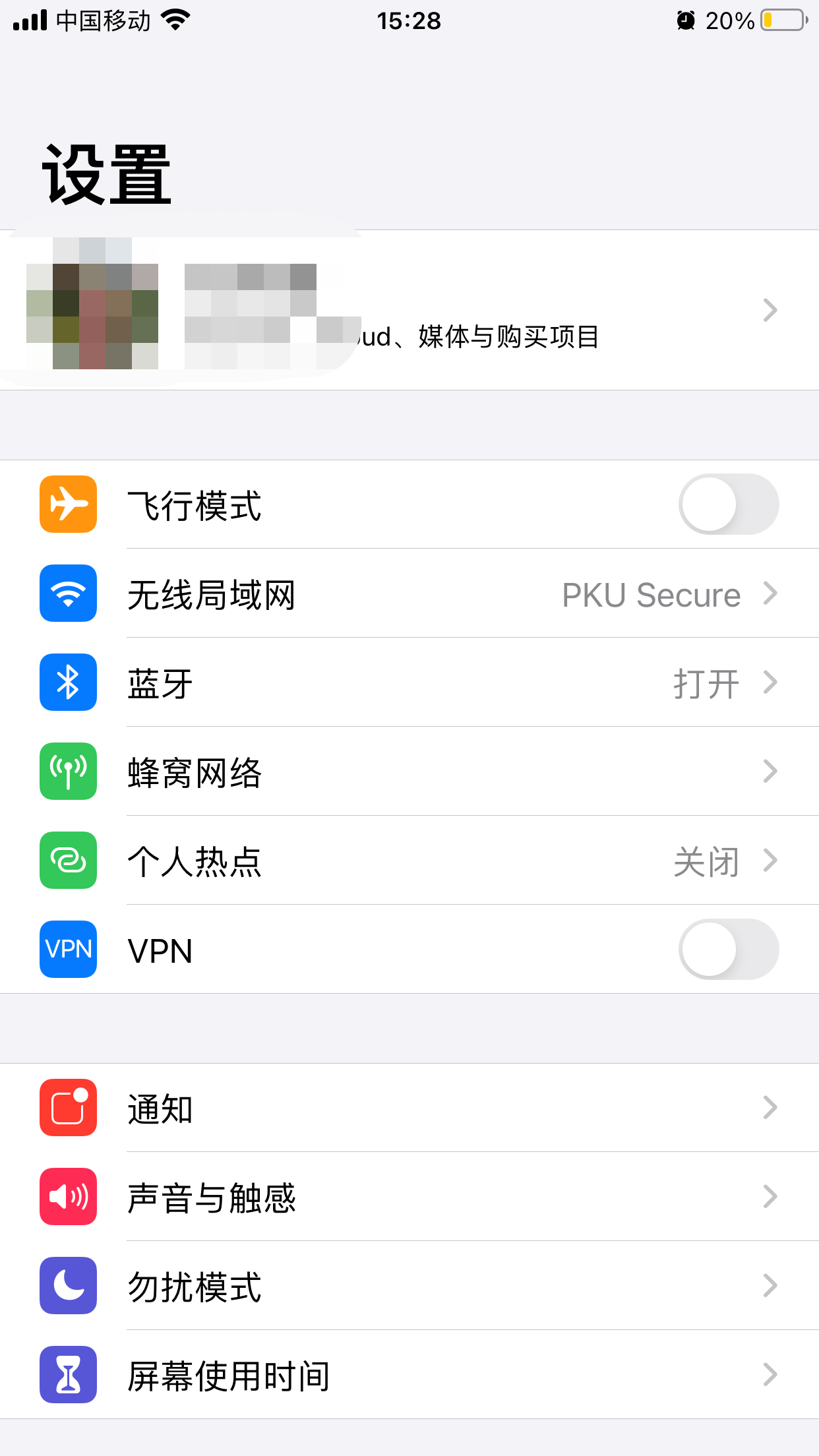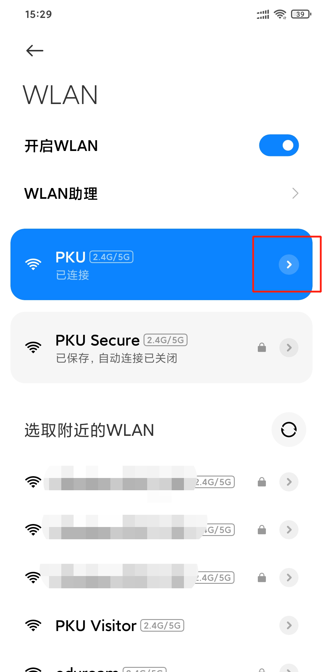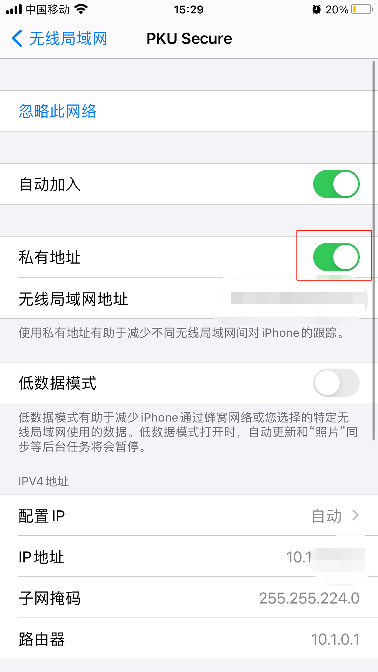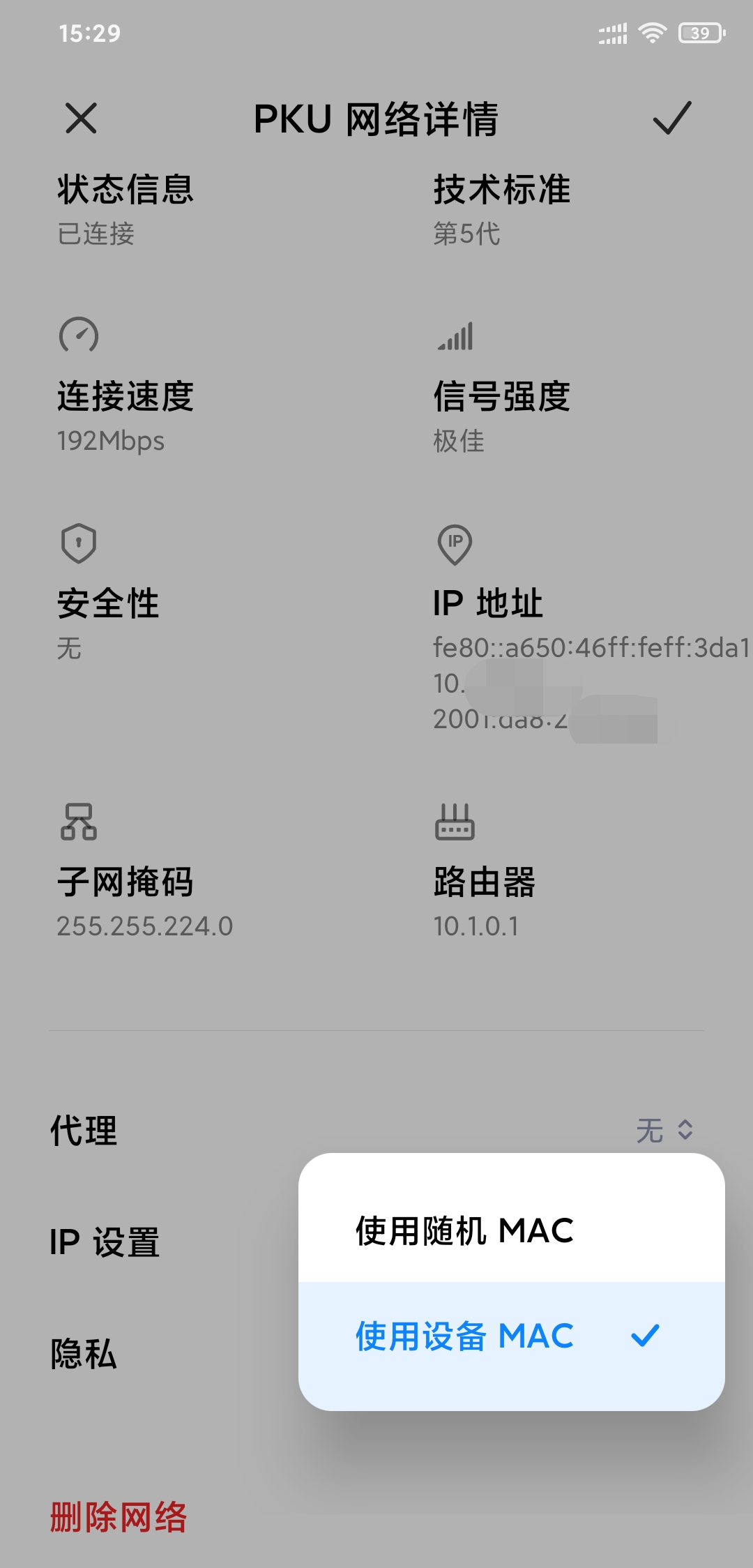 在“设置”-“WLAN”-“PKU”-“隐私”-“使用设备MAC”, 不要选择使用随机MAC。如图: