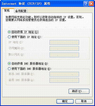 4、在“常规”下,选中“自动获得IP地址”,再选中“自动获得DNS服务器地址”,然后点击[确定]完成全部设置。