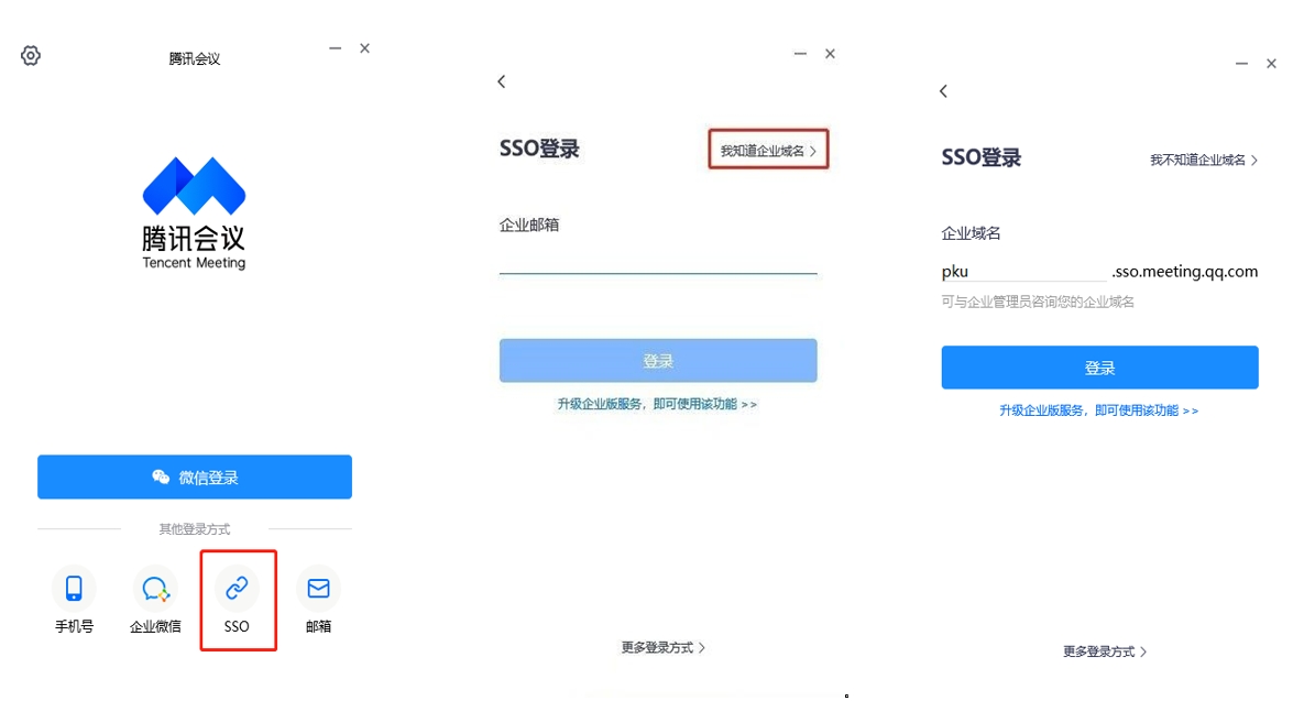 1 打开腾讯会议软件,点击登录页面的“SSO”,点击左上角“我知道企业域名”,在企业域名处填写“pku”,点击“登录”按钮。如下图所示:
