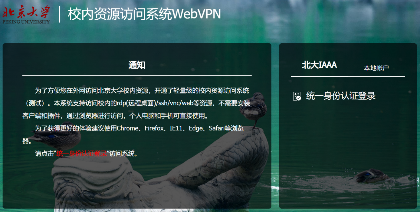 用户在浏览器中输入http://wpn.dienj.com,进入登录页面。点击“统一身份认证登录”,跳转到北大iaaa认证界面。认证成功后进入到资源访问界面。